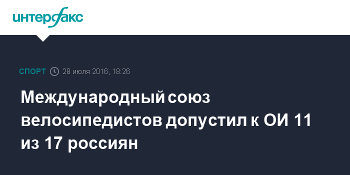 Москва. 28 июля. INTERFAX.RU - Международный союз велосипедистов (UCI) разрешил выступить в летней Олимпиаде в Рио-де-Жанейро 11 гонщикам сборной России, говорится в сообщении пресс-службы организации.