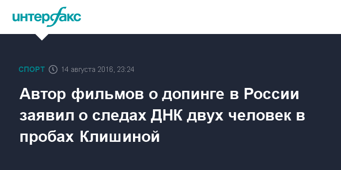 Москва. 14 августа. INTERFAX.RU - В допинг-пробе российской легкоатлетки Дарьи Клишиной присутствуют следы ДНК двух человек, сообщил автор фильмов о допинге в РФ, журналист немецкого телеканала ARD Хайо Зеппельт.