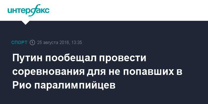 Москва. 25 августа. INTERFAX.RU - Россия организует соревнования в стране для паралимпийцев, которым отказано участвовать в Паралимпиаде в Рио, причем вознаграждение за призовые места будет аналогичным вознаграждению за медали Паралимпиады, заявил президент России Владимир Путин.