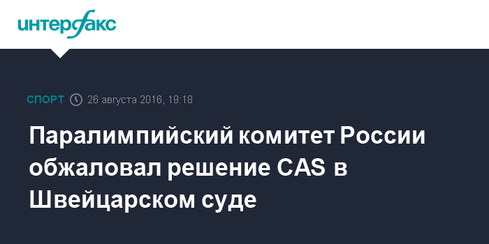 23 августа Спортивный арбитражный суд (CAS) отклонил апелляцию Паралимпийского комитета России на решение от 7 августа о приостановлении членства ПКР в МПК. Суд в Лозанне решил, что это было сделано в соответствии с правилами Международного паралимпийского комитета.