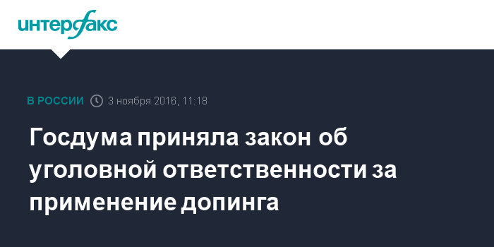 Москва. 3 ноября. INTERFAX.RU - Госдума в четверг приняла во втором и в третьем, окончательном, чтении закон, вводящий уголовное наказание за применение допинга в спорте.