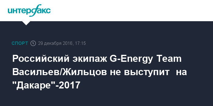 Москва. 29 декабря. INTERFAX.RU - Российский экипаж G-Energy Team в составе пилота Владимира Васильева и штурмана Константина Жильцова не выступит на ралли-рейде "Дакар"-2017, но примет участие в ралли-марафоне "Африка Эко Рейс-2017".