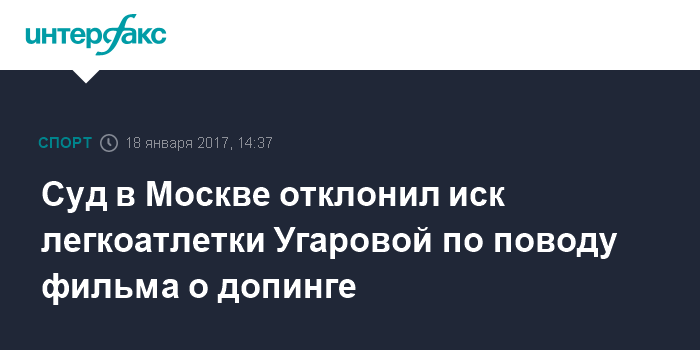 Москва. 18 января. INTERFAX.RU - Дорогомиловский суд Москвы отклонил иск легкоатлетки Кристины Угаровой о защите чести и достоинства к немецкому телеканалу ARD в связи с фильмом о допинге в российском спорте, сообщила "Интерфаксу" в среду пресс-секретарь суда Евгения Горохова.