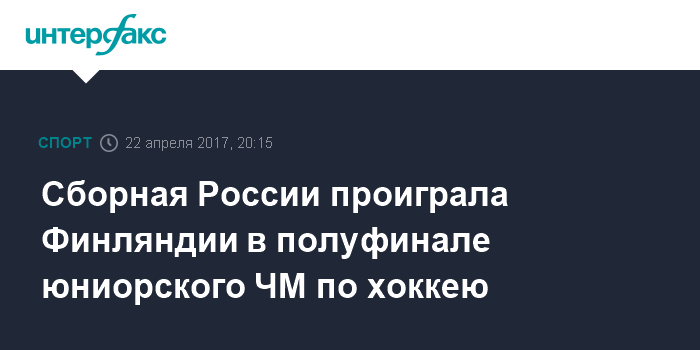 Москва. 22 апреля. INTERFAX.RU - Сборная России по хоккею проиграла команде Финляндии в полуфинале юниорского чемпионата мира 2017 года. Финны одержали победу в овертайме со счетом 2:1.