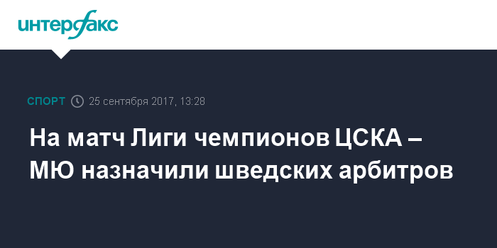 Москва. 25 сентября. INTERFAX.RU - Матч второго тура группового этапа Лиги чемпионов УЕФА между московским ЦСКА и английским "Манчестер Юнайтед" обслужит шведская бригада арбитров во главе с Юнасом Эрикссоном, сообщается на сайте УЕФА.
