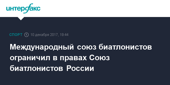 Москва. 10 декабря. INTERFAX.RU - Международный союз биатлонистов (IBU) частично ограничил в правах Союз биатлонистов России (СБР), сообщается на официальном сайте IBU.