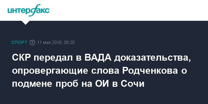 Москва. 11 мая. INTERFAX.RU - Следственный комитет России (СКР) передал во Всемирное антидопинговое агентство (ВАДА) доказательства, опровергающие заявление экс-главы Московской антидопинговой лаборатории Григория Родченкова о подмене допинг-проб в сочинской лаборатории в 2014 году, сообщила официальный представитель СКР Светлана Петренко.