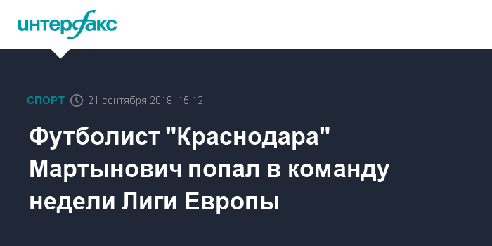 Москва. 21 сентября. INTERFAX.RU - Защитник футбольного клуба "Краснодар" Александр Мартынович попал в символическую сборную, составленную по итогам первого тура группового этапа Лиги Европы УЕФА.