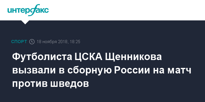 Москва. 18 ноября. INTERFAX.RU - Защитник московского ЦСКА Георгий Щенников вызван в сборную России по футболу для участия в матче Лиги наций УЕФА со Швецией, сообщает пресс-служба Российского футбольного союза (РФС) в воскресенье.