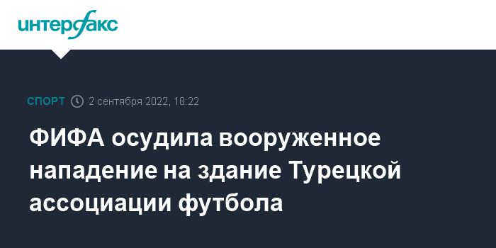 Москва. 2 сентября. INTERFAX.RU - Международная федерация футбола выражает поддержку Турецкой ассоциации футбола, на здание которой было совершено вооруженное нападение, сообщает пресс-служба ФИФА.