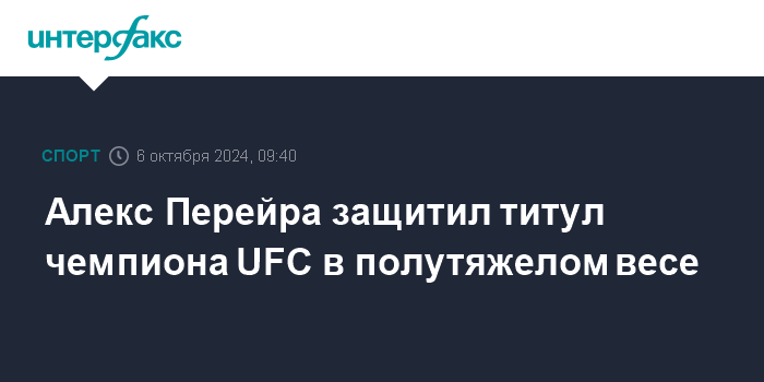 Москва. 6 октября. INTERFAX.RU - Бразильский боец смешанного стиля Алекс Перейра победил американца Халила Раунтри в главном поединке турнира UFC 307 в США.