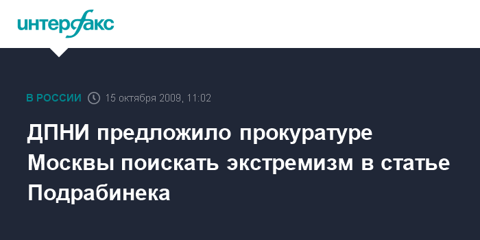 Москва. 15 октября. INTERFAX.RU - Члены Движения против нелегальной иммиграции (ДПНИ) направили в прокуратуру обращение с просьбой проверить статью журналиста Александра Подрабинека на предмет наличия в ней признаков экстремизма. "Обращение было направлено несколько дней назад в прокуратуру Москвы, а вчера звонили из отдела по борьбе с экстремизмом и уточняли ряд деталей. Это означает, что они приняли заявление и начали по нему соответствующую проверку", - заявил в четверг "Интерфаксу" один из лидеров ДПНИ Александр Белов.