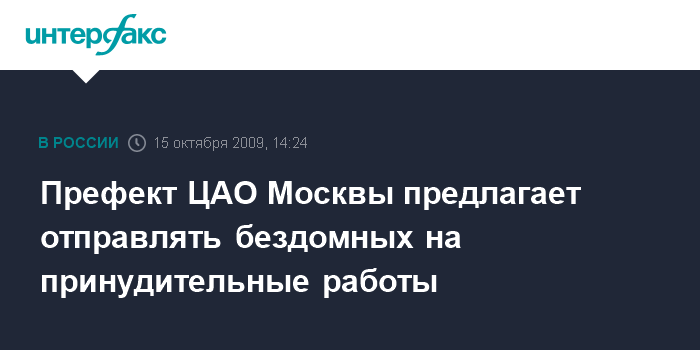 Москва. 15 октября. INTERFAX.RU - Лиц, занимающихся бродяжничеством, следует в добровольно-принудительном порядке отправлять на работу, считает префект Центрального административного округа Москвы Алексей Александров.