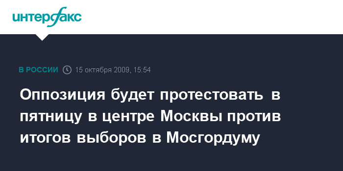 Москва. 15 октября. INTERFAX.RU - Активисты оппозиционных движений в пятницу проведут в Москве акцию с требованием отмены итогов выборов в столичную городскую думу.