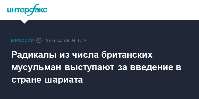 Москва. 15 октября. INTERFAX.RU - Радикальная мусульманская группировка "Ислам фор Ю-Кей" начала кампанию за введение в стране шариатского права, сообщает в четверг британская газета "Дейли телеграф".