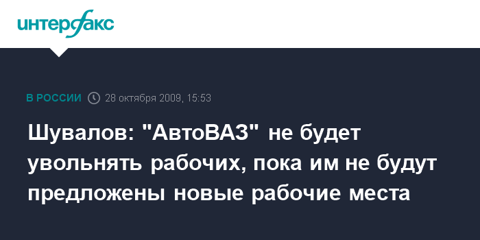 Москва. 28 октября. INTERFAX.RU - "АвтоВАЗ" не будет увольнять рабочих, пока для них не будут предложены новые рабочие места, заявил в среду журналистам первый вице-премьер РФ Игорь Шувалов, комментируя ситуацию вокруг компании. "Будет предложено поменять работу только тогда, когда будут созданы новые рабочие места. Никому не будем предлагать ни уволиться, ни оформить пенсию, пока не будут предложены новые рабочие места", - заявил он.