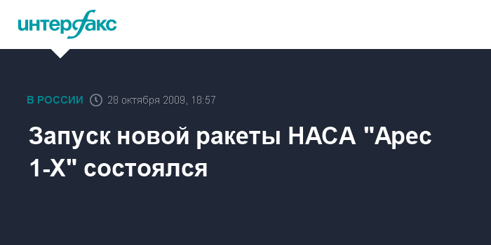 Вашингтон. 28 октября. INTERFAX.RU - Специалисты НАСА в среду осуществили испытательный пуск новой ракеты "Арес 1-Х", отложенный накануне из-за плохой погоды, сообщает телеканал НАСА.