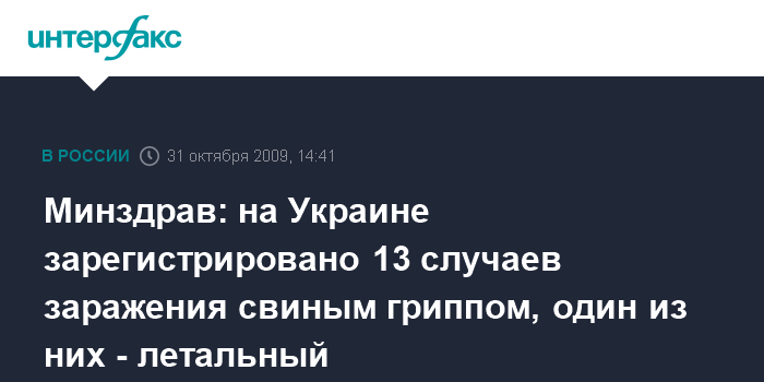 Москва. 31 октября. INTERFAX.RU - По состоянию на субботу, 31 октября, на Украине официально подтверждено 13 случаев заражения гриппом A/H1N1, в том числе один случай со смертельным исходом, сообщил министр здравоохранения страны Василий Князевич.