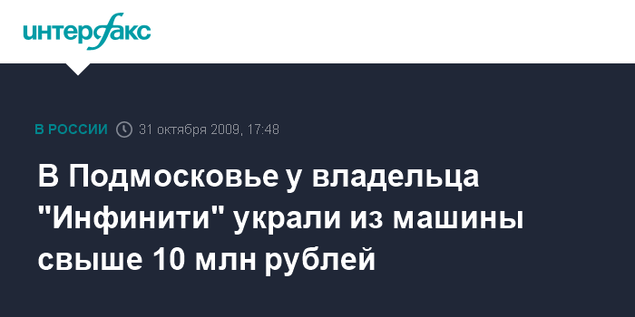 Москва. 31 октября. INTERFAX.RU - Нападение на владельца автомобиля марки "Инфинити", во время которого украдено свыше 10 млн руб, совершено в районе подмосковного поселка Томилино в субботу вечером, сообщил "Интерфаксу" источник в правоохранительных органах Московской области.