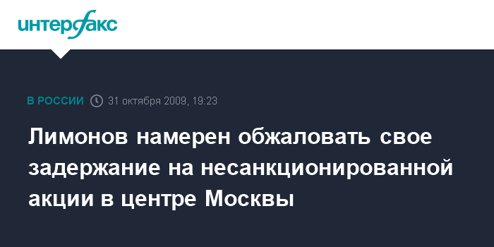 Москва. 31 октября. INTERFAX.RU - Один из лидеров оппозиционной коалиции "Другая Россия" Эдуард Лимонов намерен обжаловать его задержание милицией в субботу в Москве, когда он собирался на не согласованный с властями митинг на Триумфальной площади.