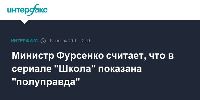 Москва. 18 января. INTERFAX.RU - Министр образования и науки РФ Андрей Фурсенко впервые прокомментировал скандальный сериал "Школа", он согласился с некоторыми выводами, сделанными в фильме. "Это правда, но не вся, это полуправда. Показывать ее не очень корректно", - сказал Фурсенко журналистам в понедельник.