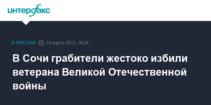 Москва. 19 марта. INTERFAX.RU - В Центральном районе Сочи совершено разбойное нападение на дом ветерана войны. "Преступники избили 87-летнего ветерана войны Левона Какосяна, забрали у него более 14 тысяч рублей, а потом оставили его умирать, включив газовую плиту", - сообщил в пятницу агентству "Интерфакс-Юг" внук ветерана Арсен Малхасян.