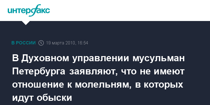Москва. 19 марта. INTERFAX.RU - В Духовном управлении мусульман Петербурга и Северо-Запада заявляют, что в подведомственных им религиозных учреждениях обыски не проводятся. "Ни в одной нашей молельне обысков нет", - заявил "Интерфаксу" в пятницу представитель управления. Он предположил, что обыски, о которых сообщил СКП, проходят в религиозных организациях, учрежденных приехавшими недавно в Петербург мигрантами и не входящих в подчинение управления. "Все эти организации открыто нарушают закон, и мы к ним никакого отношения не имеем, к этим организациям, которые наплодились за последний период времени", - подчеркнул собеседник агентства.