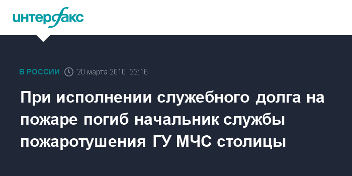 Москва. 20 марта. ИНТЕРФАКС-МОСКВА - Найдено тело начальника службы пожаротушения ГУ МЧС по Москве полковника Евгения Чернышева.