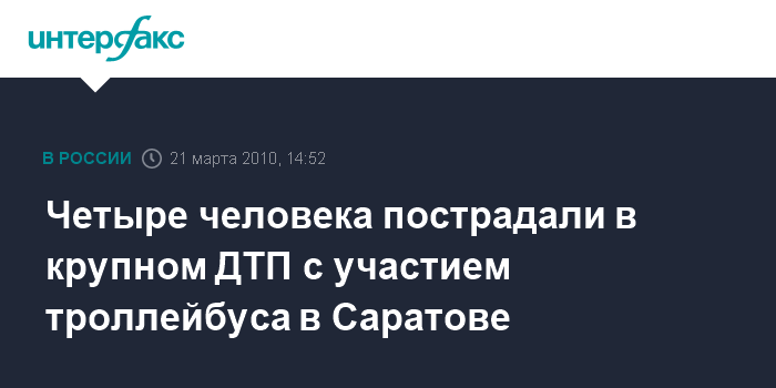 Саратов. 21 марта. INTERFAX.RU - В Ленинском районе Саратова столкнулись пять легковых автомобилей и троллейбус, в результате пострадали четыре человека. В Главном управлении "Центр медицины катастроф Саратовской области" агентству "Интерфакс-Поволжье" сообщили в воскресенье, что ДТП произошло на улице Панфилова между городскими районами "6-я Дачная" и "7-я Дачная" около 19:30 мск субботы. "Столкнулись троллейбус и пять легковых автомобилей. В результате аварии пострадали четверо взрослых людей, трое из которых были госпитализированы, еще один от госпитализации отказался", - отметил собеседник агентства.