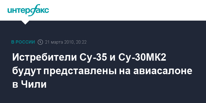 Москва. 21 марта. ИНТЕРФАКС-АВН - Центральное место в экспозиции компании "Сухой" на международном авиационно-космическом салоне ФИДАЕ- 2010, который пройдет в Чили с 23 по 28 марта, будет занимать информация о многофункциональных истребителях Су-35 и Су-30МК2.