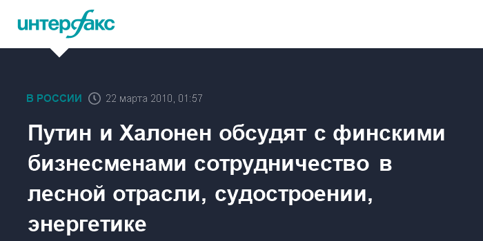 Путин и Халонен обсудят с финскими бизнесменами сотрудничество в лесной отрасли, судостроении, энергетике