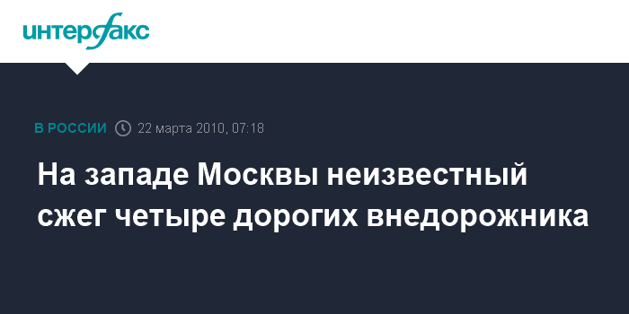 Москва. 22 марта. INTERFAX.RU - В Западном административном округе Москвы неизвестный сжег сразу четыре дорогостоящих джипа. "Поджигатель во дворе дома №8, к.2 по Новоорловской улице около 6:00 утра поджег четыре престижных джипа - 3 "Тойоты" и один "Лэнд Ровер". Машинам нанесены значительные повреждения", - сообщил "Интерфаксу" источник в правоохранительных органах столицы. На месте происшествия работают оперативно-следственные группы, которые устанавливают приметы поджигателя, для чего изучают записи с подъездных видеокамер наружного наблюдения.