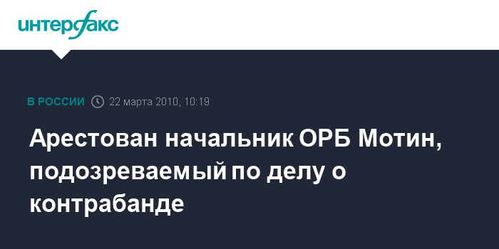 Москва. 22 марта. INTERFAX.RU - Начальник оперативно-розыскного бюро (ОРБ) МВД России полковник Сергей Мотин арестован по подозрению в участии в организованной преступной группе, занимавшейся контрабандой, сообщили в СКП. "Суд удовлетворил ходатайство следственных органов СКП по Краснодарскому краю и избрал в отношении начальника ОРБ № 11 МВД РФ полковника милиции Сергея Мотина, подозреваемого в совершении контрабанды, меру пресечения в виде заключения под стражу", - говорится в сообщении, размещенном в понедельник на сайте СКП РФ.