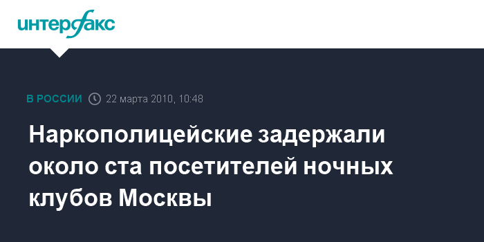 Москва. 22 марта. INTERFAX.RU - Федеральная служба РФ по наркоконтролю (ФСКН) организовала рейд по ночным клубам Москвы - задержаны около ста человек, в их числе студенты элитных вузов. "Всего в ходе проверок задержано около ста человек в состоянии наркотического опьянения. В числе задержанных оказалось немало студентов престижных московских вузов - РЭА имени Плеханова, РУДН, РГМУ, МИИТ, МАДИ", - говорится в официальном сообщении ФСКН, поступившем в "Интерфакс" в понедельник.