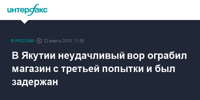 Москва. 22 марта. INTERFAX.RU - Милиционеры города Алдан на юге Якутии задержали в ночь на понедельник злоумышленника, который предпринял три попытки ограбления круглосуточных магазинов за одну ночь.
