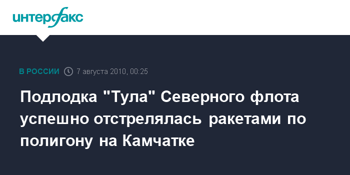 Москва. 7 августа. INTERFAX.RU - Атомная подводная лодка Северного флота "Тула" в пятницу произвела залповую стрельбу двумя межконтинентальными баллистическими ракетами из акватории Баренцева моря по полигону Кура на Камчатке.