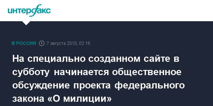 Москва. 7 августа. ИНТЕРФАКС - Публичное обсуждение нового законопроекта - "О милиции" - начинается в субботу в Интернете. Проект федерального закона впервые выносится на суд общественности таким образом.