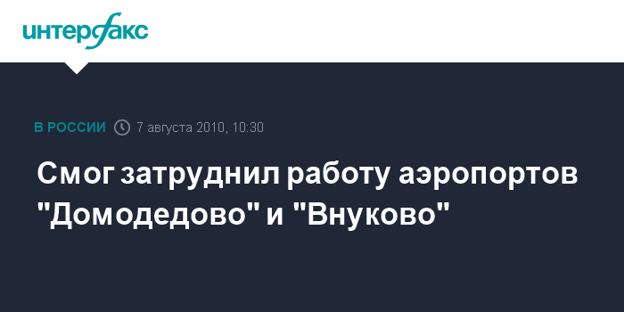 Москва. 7 августа. INTERFAX.RU - Экологическая ситуация повлияла на работу аэропортов Внуково и Домодедово, несколько рейсов ушло на посадку на запасные аэродромы, сообщили "Интерфаксу" в Росавиации.