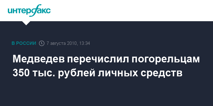 Москва. 7 августа. INTERFAX.RU - Президент России Дмитрий Медведев перечислил из своих личных средств 350 тысяч рублей на благотворительный счет, открытый Общественной палатой для помощи пострадавшим от пожара в центральных регионах России, сообщила пресс-секретарь главы государства Наталья Тимакова.