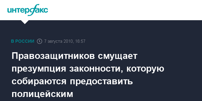 Москва. 7 августа. INTERFAX.RU - Появление в новом законопроекте о полиции слов о презумпции законности вызвало беспокойство в правозащитном сообществе.