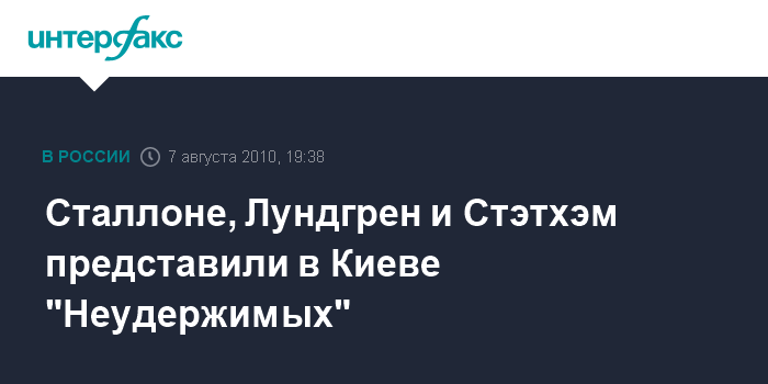Киев. 7 августа. ИНТЕРФАКС-УКРАИНА - Голливудские актеры Сильвестр Сталлоне, Дольф Лундгрен, Джейсон Стэтхэм презентовали в субботу в Киеве приключенческий боевик "Неудержимые" в рамках мирового промо-тура.