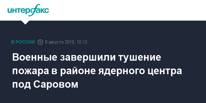 Москва. 8 августа. INTERFAX.RU - Военнослужащие Минобороны РФ завершили мероприятия по борьбе с пожарами в районе федерального ядерного центра под Саровом в Нижегородской области и готовы к выполнению новых задач, заявил пресс-секретарь управления пресс-службы и информации Минобороны по тылу Владимир Дробышевский.