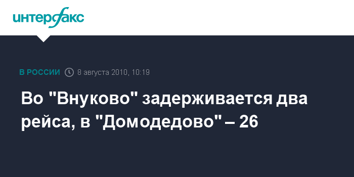 Москва. 8 августа. INTERFAX.RU - Уменьшилось число рейсов, задерживаемых в московских аэропортах в связи с плохой видимостью из-за смога. Как сообщили "Интерфаксу" в воскресенье в Центральной диспетчерской службе, "по состоянию на 10:00 мск в аэропорту "Внуково" задерживается два рейса, в "Домодедово" - 26, в "Шереметьево" задержанных вылетов нет".