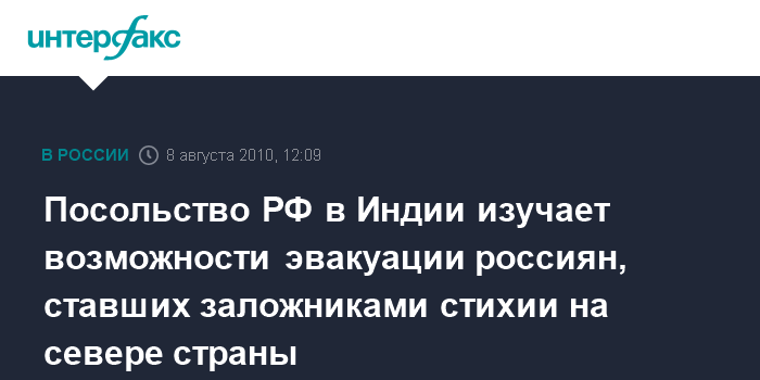 Дели. 8 августа. INTERFAX.RU - Посольству России удалось выйти на связь с двумя группами российских туристов общей численностью 25 человек, которые оказались заложниками стихийного бедствия на севере Индии, в штате Джамму и Кашмир.