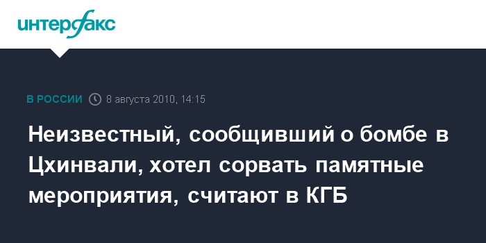 Цхинвали. 8 августа. INTERFAX.RU - В КГБ Южной Осетии полагают, что сообщение о взрывном устройстве, якобы заложенном на привокзальной площади в Цхинвали, было сделано с целью помешать проведению памятных мероприятий в городе.