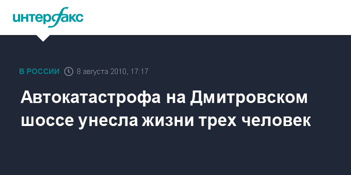 Москва. 8 августа. INTERFAX.RU - Три человека погибли в результате серьезной автомобильной аварии в воскресенье на севере Москвы, сообщил "Интерфаксу" источник в правоохранительных органах. Он рассказал, что авария произошла примерно в 16:00 на Дмитровском шоссе в районе дома № 165. "В результате столкновения автомобилей "Шевроле" и "Дэу" последняя машина загорелась, находившиеся в ней двое человек погибли", - рассказал собеседник агентства. Он добавил, что также погиб один из людей, находившихся в "Шевроле".