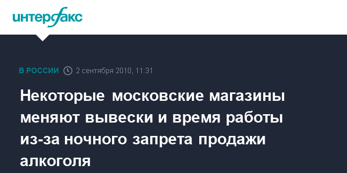 2 сентября. INTERFAX.RU - Введенный с 1 сентября в Москве запрет на продажу алкоголя с долей этилового спирта свыше 15% с 22:00 до 10:00 привел к изменениям в работе ряда магазинов.