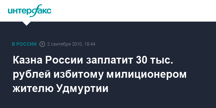 Казна России заплатит 30 тыс. рублей избитому милиционером жителю Удмуртии