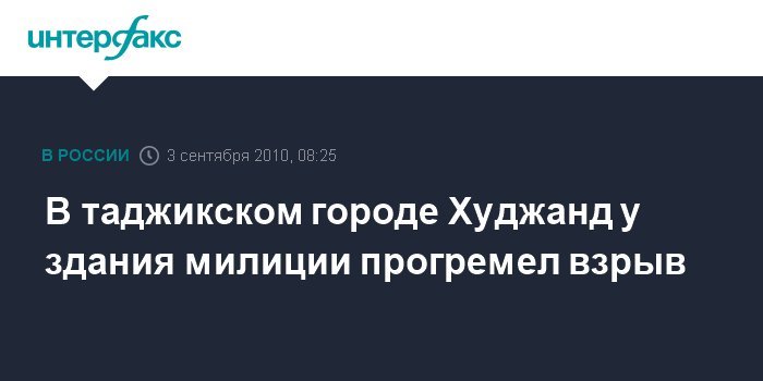 Душанбе. 3 сентября. INTERFAX.RU - В городе Худжанд на севере Таджикистана в пятницу утром у здания регионального управления МВД по борьбе оргпреступностью (РУБОП) произошел взрыв, сообщили "Интерфаксу" высокопоставленный источник в силовых структурах республики.