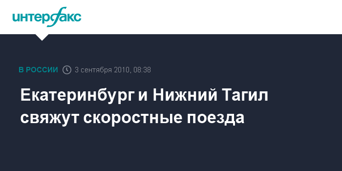Екатеринбург. 3 сентября. INTERFAX.RU - Губернатор Свердловской области Александр Мишарин поставил задачу по запуску в 2013 г. скоростного железнодорожного сообщения между Екатеринбургом и Нижним Тагилом, стоимость проекта оценивается в 17 млрд рублей.
